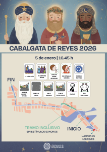 Este año Melchor, Gaspar y Baltasar desfilarán por las calles en tres carrozas, desde donde saludarán a la ciudadanía por todo el trayecto. Además, este es el segundo año en que la cabalgata tiene un tramo del trayecto inclusivo (desde la rotonda Carmen-Socusa hasta el cruce con Rafael Valls), por el cual los y las participantes transitarán en silencio, sin estímulos sonoros y lumínicos. De este modo, se tiene en cuenta las personas con necesidades especiales como por ejemplo: hipersensibilidad auditiva, trastornos del espectro autista o dificultades para convivir en ambientes que puedan ser abrumadores.