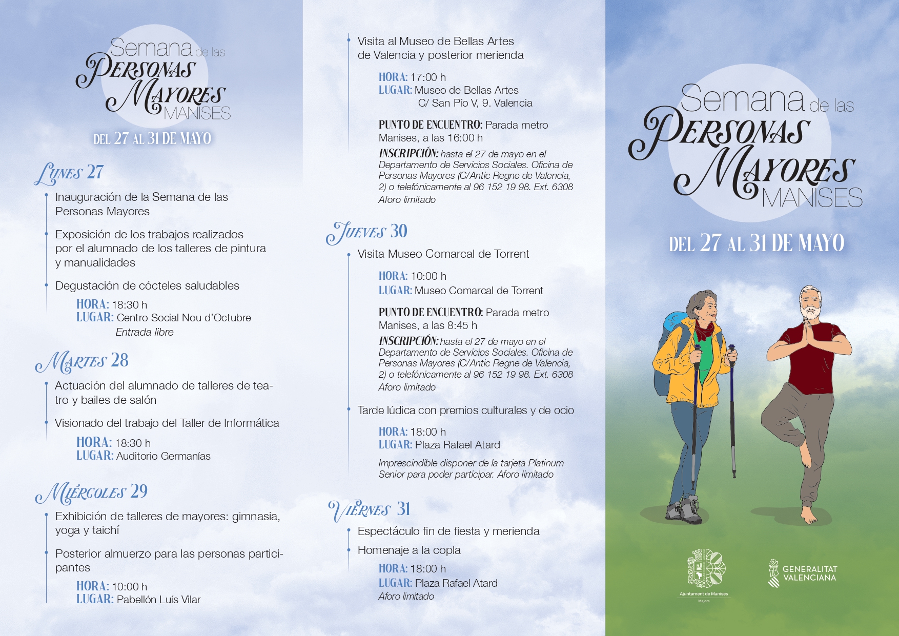 El Ayuntamiento de Manises, a través de la Concejalía de Mayores, celebra la Semana de las Personas Mayores 2024, con diversas actividades gratuitas, lúdicas y culturales, que se llevarán a cabo del lunes 27 hasta el viernes 31 de mayo.