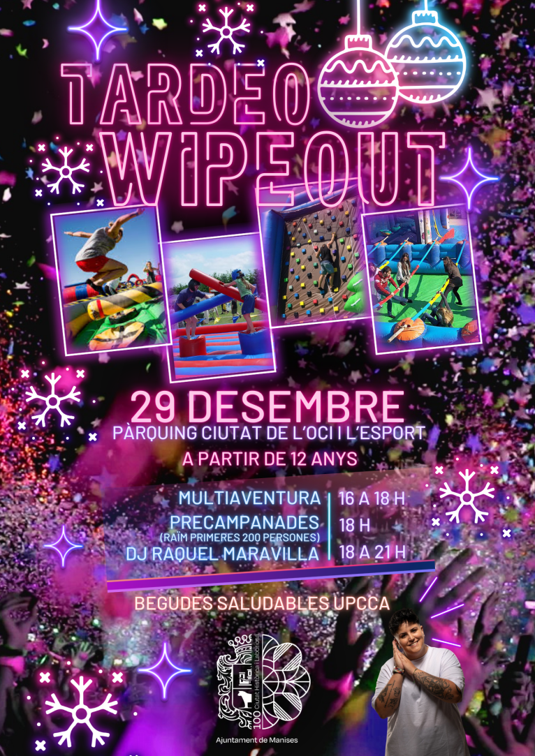 Manises, 18 de desembre de 2024-. Manises celebrarà una festa per als més joves, “Tardeo Wipeout”, la vesprada del 29 de desembre, a partir de les 16 hores, a la Ciutat de l’Oci i de l’Esport, lloc que pretén convertir-se en punt de trobada entre la joventut, per a gaudir així d’activitats d’oci saludable.