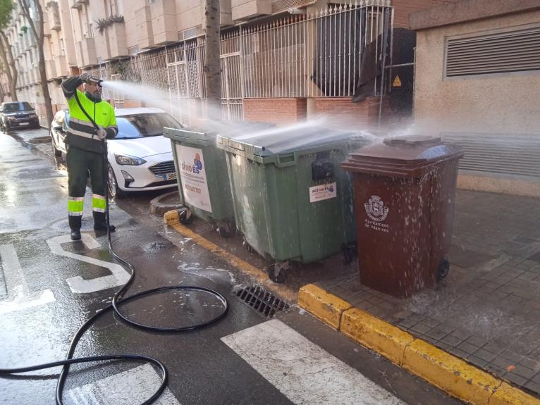 Paral·lelament, l’equip de neteja està executant treballs per a higienitzar i desinfectar contenidors i mobiliari urbà, unes tasques que s’estan duent a terme amb un sistema d’aigua a pressió i altres mètodes especialitzats amb diferents ferramentes.